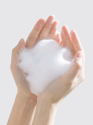 手のひらに適量を取り少量の水またはぬるま湯でよく泡立ててください。きめ細かくなるまで泡立てたら、顔全体に円を描くようにやさしく洗い、水またはぬるま湯で十分に洗い流してください。 |